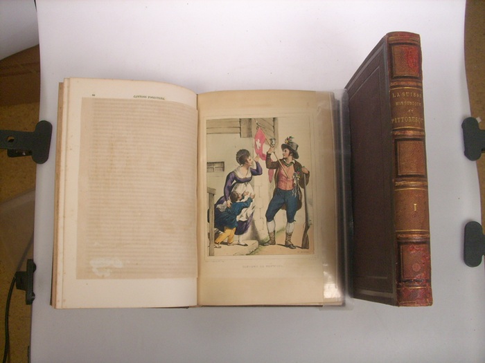 La Suisse historique et pittoresque description de ses vingt-deux cantons. Ornée de joliesm vues gravées sur acier, de costumes et de cartes. 2 vols. Paris, Didier 1858. LVI, 208, 261 S. Half leather. Good condition. Gilt edge. Leather spine partly discoloured. Corners very mildly bumped. Stamps on front papers. Paper foxed, otherwise clean. With 70 engravings, 3 maps and 17 coloured lithographies. Vol.1: front hinge slightly damaged.