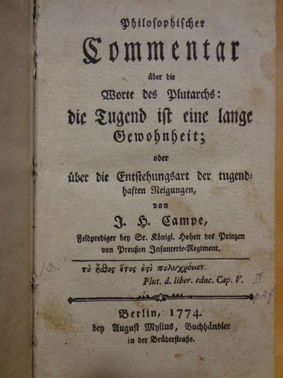 Philosophischer Commentar über die Worte des Plutarchs: die Tugend ist eine lange Gewohnheit; oder über die Entstehungsart der tugendhaften Neigungen. Berlin/ August Mylius (Buchhändler). 1774. 126 S. kl. 8°. Einband berieben; auf Vorsatzblatt Besitzvermerk; Titelblatt & Schnitt leicht stockfleckig; ansonsten wohlerhaltenes Exemplar!.