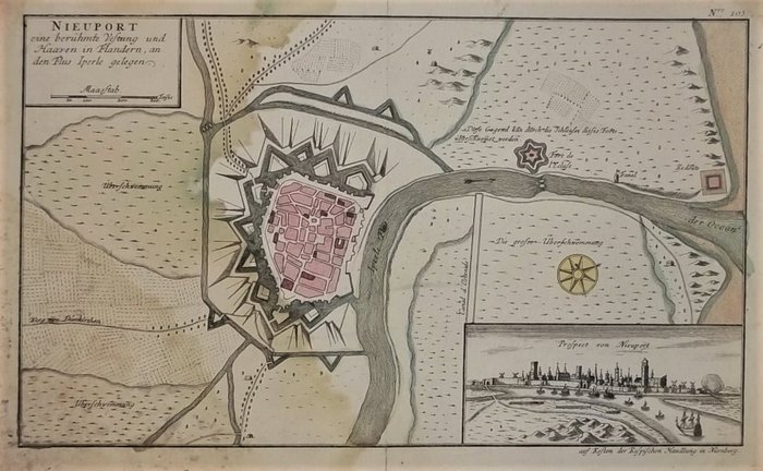 "Nieuport eine berühmte Vestung und Haaven in Flandern (...)". Altkolorierter Kupferstich. Nürnberg, Raspische Buchhandlung, um 1760. Ca. 23 x 38 cm (Druckplatte); 24 x 38 cm (ganze Blatt). Festungsgrundriss und kleine Gesamtansicht von Nieuwpoort in Flandern auf einem Blatt. - Allseitig knapp bis nahe an die Druckplatte beschnitten. Knickfalte in der Blattmitte mit kl. gefestigten Randeinrissen. Linkes Blattdrittel wasserrandig.