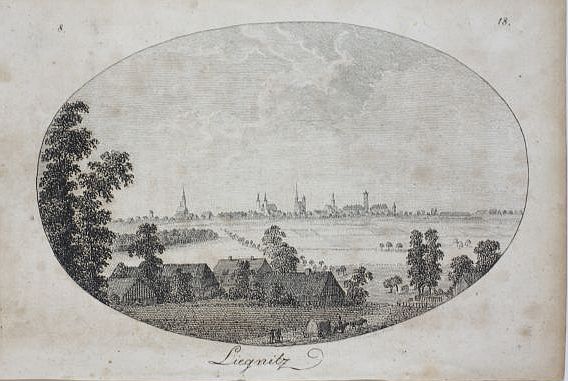 Liegnitz. - Breslau:, Friedrich Barth, 1807. Kupferstich in oval 9 x 13,5 cm, Blattgröße 10,5 x 18 cm. Der Kupferstich von F.G. Endler zeigt den Blick auf den Ort in der Ferne. - Aus: Der Breslauische Erzähler. Beiliegend eine Seite Text "Erklärung des Kupfers". - Friedrich Gottlieb Endler, Architekt und Kupferstecher 1763 - nach 1830. Thieme-Becker 10, 520. - Papier fleckig und gebräunt. Schönes Blatt.
