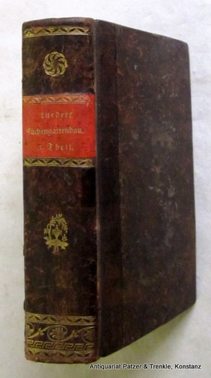 Fortsetzung der in den Briefen über die Bestellung eines Küchengartens gegebenen Anleitung zum Küchengartenbau Der Küchengartenbriefe Zweyter Theil. 2. verbesserte u. vermehrte Auflage. Hannover, Helwingsche Hofbuchhandlung, 1793. Kl.-8vo. Mit einigen tabellarischen Illustrationen. LVI, 676 S., davon 4 Bl. zu Tabellen ausfaltbar. Hldr.d.Zt. mit rotem Rückenschild u. Rückenvergoldung; leicht berieben, unteres Kapital im Gelenk mit kl. Fehlstelle. Dochnahl S. 98. - Schönes Exemplar des Ratgebers für den privaten Nutzgärtner, mit sehr detaillierten Ratschlägen für den erfolgversprechendsten Anbau von allen Arten von Gemüse und Obst (Erdbeeren, Artischocken, Hopfen etc.). Ein besonders ausführliches Kapitel ist dem Spargel (S. 1-99) gewidmet u. auch diversen Wintergemüsen ("brauner Winterkohl etc.) gilt besondere Aufmerksamkeit. Umfangreichster Teil ist der "Versuch einer Anweisung, wie ein jeder Hausvater die benöthigten Gartensämereyen, ohne viele Mühe, und zugleich so ziehen könne, daß sie nicht ausarten" (S. 293-407). Die letzten Seiten (659-666) enthalten einen "Catalogus von Gartensaamen, im Jahre 1791, zu bekommen bey Johann und Matthias Klefeker in Hamburg". Die Publikationsgeschichte der "Briefe" zeigt, dass die Bände eigenständige, nicht aufeinander aufbauende Werke sind: Band 1 erschien 1768 (2. Aufl. 1773, 3. 1778), der hier in 2. u. letzter Auflage angebotene Band 2 ("Fortsetzung") erschien zuerst 1776 und schließlich der dritte ("Beschluss") zuerst 1779 und in 2. Auflage 1783. - Vorsatz mit älteren Besitzeinträgen, sonst schönes, dekorativ gebundenes Exemplar.