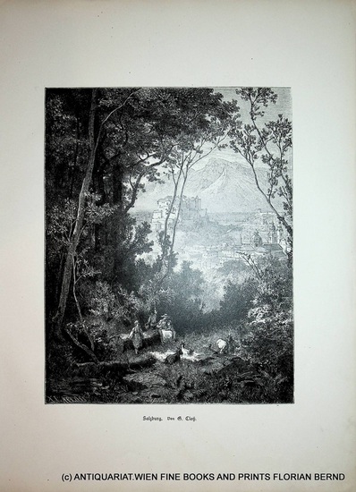 SALZBURG, Stadt mit Hohensalzburg, Ansicht ca. 1880 originale Druckgrafik ca. 1880. original Xylographie von Adolf Clo? (1840?1894) und Emil B?hme nach Gustav Clo? (1840-1870), Blattformat ca. 36,5 x 26,5 cm.