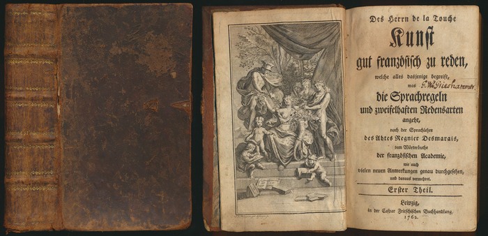 Des Herrn de la Touche Kunst gut französisch zu reden. Welche alles dasjenige begreift, was die Sprachregeln und zweifelhaften Redensarten angeht, nach der Sprachlehre des Abtes Regnier Desmarais, dem Wörterbuche der französischen Academie, wie auch vielen neuen Anmerkungen genau durchgesehen, und daraus vermehret. 2 Teile (in 1 Band). Leipzig, in der Caspar Fritschischen Buchhandlung, 1762. Klein-8°. 18,5 x 11 cm. Frontispiz, Titelblatt, XIV, 294 Seiten, 5 Blatt, Titelblatt, 480 Seiten. Ganzlederband der Zeit mit Farbschnitt und marmoriertem Vorsatzpapier. 1. Teil: VD18 90644034. 2. Teil: VD18 90644042. Einband deutlich berieben, einige kleine Fehlstellen im Bezug, an den Kapitalen mit kleinen Einrissen, vorderer Außenfalz fast komplett eingerissen. Vorsatzpapier mit Frontispiz-Blatt zusammengeklebt. Titelblatt mit Namenseintrag, dort rückseitig mit einem Papierstück verstärkt. Wenige Blattecken leicht knickspurig, Blätter kaum fleckig. Innen schön erhalten.