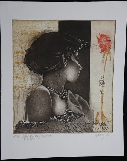 "Über die Vergänglichkeit der Rose" Farbradierung. Auflage 68/100. Mit Bleistift unten bezeichnet, signiert und datiert 1985. Format (Platte): 25,5 x 22,5 cm. Blattgröße: 35 x 28 cm. *Sehr schöne Arbeit voller Anmut. - Tadellos erhalten.