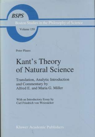 Kant's theory of natural science. Von Maria u. Alfred E. Miller und Peter Plaass. Einleitung Carl Friedrich von Weizsäcker. Boston Studies in the Philosophy of Science, 159. Dordrecht, Boston, London: Kluwer Academic Publishers, 1994. XVI, 367 S. Originalleinen mit Schutzumschlag. Aus der Bibliothek von Prof. Wolfgang Haase, langjährigem Herausgeber der ANRW und des International Journal of the Classical Tradition (IJCT) / From the library of Prof. Wolfgang Haase, long-time editor of ANRW and the International Journal of the Classical Tradition (IJCT). - Schutzumschlag berieben, Buchrücken ausgeblichen, sonst guter Zustand und innen sauber / dust jacket rubbed, spine faded, otherwise good condition and clean inside. - Plaass?s treatise stood at the beginning of a renewed wave of scholarship regarding Kant?s Metaphysical Foundations of Natural Science (MF). Plaass argues that the MF represents an integral step in Kant?s development between the two editions of the Critique of Pure Reason. The MF repeats the ?Copernican turn,? using the conditions of subjectivity to derive the metaphysical determinations of ?matter? as the object of natural science with the new method called ?metaphysical construction,? which simultaneously grounds the mathematizability of physics. The translators provide background and analysis of Plaass?s work, extend it to include the body of the MF and offer a variation on the analysis of the relationship between mathematics and metaphysics in the MF. They discuss its relevance for contemporary paradigm-dependency approaches to the philosophy of science and for philosophical hermeneutics. The book should be of interest not only to Kant specialists but also to students of the philosophy of science in general. / TABLE OF CONTENTS TRANSLATORS? PREFACE TRANSLATORS? INTRODUCTION AND COMMENTARY Table of Contents to introduction and Commentary Section 1. Aims and Structure of this Introduction Section 2. Central Themes of Kant?s Philosophy of Science: Metaphysics and Mathematics as the a priori Basis for Natural Science Section 3. Kant?s Assumptions and Questions as the Background for Interpreting his Philosophy Section 4. Overall Goal, Structure and Content of the MF Section 5. Metaphysical Construction: The Central Method of the MF Section 6. Plaass?s Interpretation of ?Metaphysical Construction" and the Issue of ?Objective Reality? in the MF Section 7. The Relation of the Empirical Part of Physics to the Pure Part Section 8. The Relevance of Kant?s Philosophy of Natural Science Today KANT?S THEORY OF NATURAL SCIENCE ACCORDING TO P. PLAASS: An Introductory Analytic Essay by C. F. von Weizsàcker (1965) KANT?S THEORY OF NATURAL SCIENCE - Peter Plaass PREFACE - C. F. von Weizsàcker FOREWORD - P. Plaass Table of Contents Chapter 0. Introduction Chapter 1. The Object of Natural Science: Nature Chapter 2. Doctrine and Science Proper Chapter 3. The Pure Part of Natural Science Chapter 4. The Empirical Concept of Matter Chapter 5. Pure Natural Science as Pure Doctrine of Motion Chapter 6. The Function of the Pure Part BIBLIOGRAPHY Selected Bibliography since Plaass Glossary Index. ISBN 0792327500.