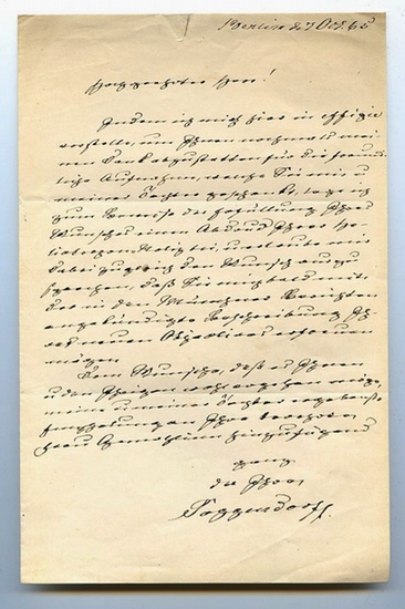 Eigenh. Brief mit U. (?Poggendorf?).   Berlin, 7. Oktober 1865. 1 S. auf Doppelblatt. Gr.-8vo. An den namentlich nicht genannten Physiker, Mathematiker und Astronomen Carl August Ritter von Steinheil (1801?1870): ?Indem ich mich hier in effigie vorstelle, um Ihnen nochmals meinen Dank abzustatten für die freundliche Aufnahme, welche Sie mir u. meiner Tochter geschenkt, lege ich zum Beweise der Erfüllung Ihres Wunsches einen Abdruck [...] bei, u. erlaube mir dabei zugleich den Wunsch auszusprechen, daß Sie mich bald mit der in den Münchener Nachrichten angekündigten Beschreibung Ihres neuen Objectives erfreuen mögen [...]?. ? Beide Bll. mit einem kleinen Einriß am oberen Rand; papierbedingt etwas gebräunt; ohne die erwähnte Beilage.