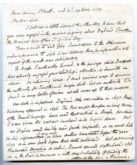 Eigenh. Brief mit U. ?Amen Corner, St. Paul?s? (London), 29. Mai 1839. 1? SS. auf Doppelblatt. 4to. An einen ?dear Lord?, der sich für die Ode ?Timotheus? des englischen Dichters und Dramatikers John Dryden interessiert hatte: ?[...] To Bayle I naturally turned; & the passage which I suspect has already engaged your Lordship?s attention, is herewith enclosed. On returning home, I tried various ways to discover the authority for Timotheus?s magic skill: but no authority to be found in any books of mine at all came up to that purpose. One date is important. Dryden?s Ode was written in 1697. Bayle?s Dictionary appeared in 1696. The Poet might therefore as being Master of the French language have read that article in Bayle, from which I have given the Extract inclosed in its English dress. But as Dryden would hardly read Greek originals, so we must look for his information at any rate in some author translated before the year 1697 or in some book before that date published. Not possessing Plutarch?s Moralia so called, I must consult Wyttenbach?s edition in the British Museum [...]?. ? Papierbedingt leicht gebräunt.