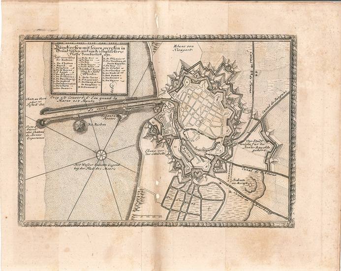 Düinkirchen mit seinen wercken in Grund zu sehen, wirt von der englischen Flotta bombartirt 1691. ca. 1695. Kupferstich. 32 x 37 cm. (Blattgröße); 21 ,5 x 30, 5 cm. (Bildausschnitt). Stellenw. gebräunt. Kl. Fehlstellen im Mittelfalz unterlegt. Schlachtplan aus dem Pfälzischen Erbfolgekrieg (1689-1697/98). - Plan de bataille de la guerre de succession du Palatinat.