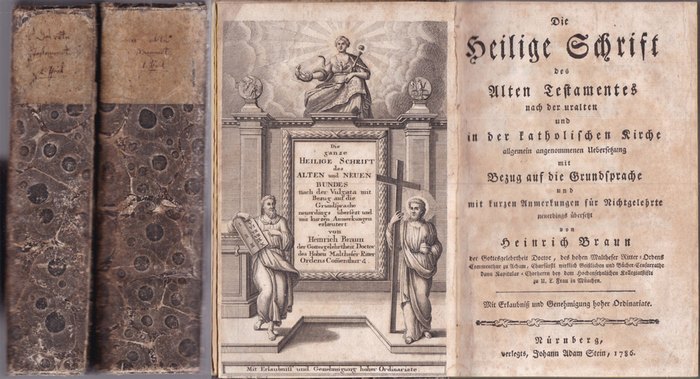 Die Heilige Schrift des Alten und Neuen Testamentes nach der uralten und in der katholischen Kirche allgemein angenommenen Uebersetzung mit Bezug auf die Grundsprache, und kurzen Anmerkungen für Nichtgelehrte neuerdings übersetzt von Heinrich Braun [... ] des hohen Maltheser Ritter-Ordens Commenthur zu Acham [...]. Erster und Zweiter Teil (Genesis - Die 2 Bücher der Machabäer). Nürnberg, Johann Adam Stein, 1786. 8°, geb. Pappeinbd., 18 Bl., S. 875-1588 S. m. gestochenem Frontispiz - ehemalige Bibliotheksexemplare, Kanten berieben, Innendeckel u. Vorsatzblätter gestempelt, mitunter stockfleckig.