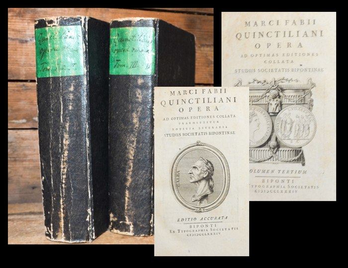 Opera ad optimas editiones collata. Praemittitur notitia literaria studiis Societatis Bipontinae. 4 in 2 Bänden. Zweibrücken, Typographia societatis, 1784. 8°., Zusammen mehr als 1600 Seiten, mit 4 gestochenen Titelvignetten. Pappbände d. Zt. Die Werke von Qunitilian (bzw. ihm zugeschrieben), komplett in vier Bänden, Text latein. Die beiden ersten Bände enthalten die Institutio oratoria, die beiden letzten die Reden mit einem kleinen Anhang: Calpurnii Flacci excerptae X rhetorum minorum. - Vorsatz jeweils mit kleinem Besitzvermerk, kaum gebräunt, etwas berieben, innen meist sauber, gut erhalten.
