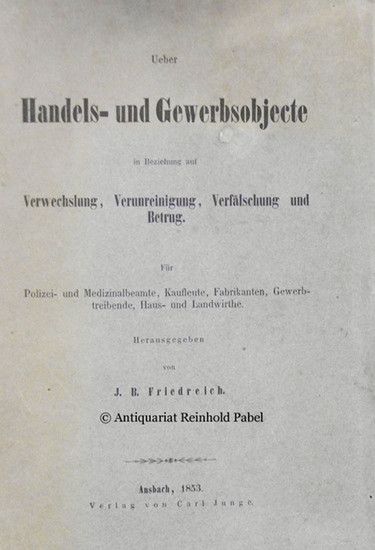 Ueber Handels- und Gewerbsobjecte in Beziehung auf Verwechslung, Verunreinigung, Verfälschung und Betrug. Für Polizei- und Medizinalbeamte, Kaufleute, Fabrikanten, Gewerbtreibende, Haus- und Landwirthe. Ansbach, Carl Junge, 1853. XII, 343 S. Gr.-8vo. OKart. Lexikon natürlicher, chemischer, pharmakologischer u. anderer (Handels-) Produkte u. Stoffe (hier Objecte genannt) von "Aal" u. "Achat" bis "Zuckersyrup" u. "Zwetschkenmuss". - Johann Baptist Friedreich (1796-1862) war ab 1820 Professor der Heilkunde in Würzburg, 1833 Gerichts- u. Landgerichtsphysikus zu Weißenburg u. 1850-1855 Gerichtsarzt u. Professor in Erlangen. Seine Publikationen betreffen vor allem Psychiatrie u. forensische Medizin (vgl. ADB 7, S. 400). - Umschlag tlw. gebräunt bzw. braunfleckig, unt. Kap. beschädigt; unaufgeschnitten.