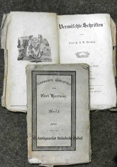 Vermischte Schriften. Erster (und zweiter) Band (von 3?). 4. Ausgabe. Kaiserslautern, gedr. bei Ludwig Vatter / Darmstadt, gedr. bei Friedrich Göbel, 1832/1833. 155 S., 16 Bll. (Subskribenten-Verzeichnis); 154 S., 1 Bl. Mit 1 lithogr. Frontispiz. Bedruckte Brosch. d. Zt. in der Gestaltung des Verfassers. Nicht in ADB/NDB; nicht bei Kosch. - In einer "Nachricht für die resp. Herren Subscribenten" am Ende von Tl. 1 u. Tl. 2 erwähnt d. Verf. das Erscheinen eines 3. Teils. - [1] An den Leser. Das Königreich Polen (Eine historische Skizze, von Christi Geburt bis 1832). Tobias. Das Kind und der Heiland. Der Trunkenbold. Die Verlobung auf Palmyras Trümmern. Die Cholera [2] Das Königreich Polen (Schluß). Yanendorf, oder der verliebte Schultheiß. Die Emigranten. Des Polen Abschied ("zu dem Stein-Abdrucke"). - Umschläge beschädigt, angestaubt u. stellenw. stockfleckig; unaufgeschnitten. - Selten.