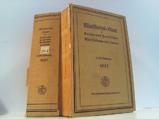Ministerial-Blatt des Reichs- und Preußischen Ministeriums des Innern. Herausgegeben vom Reichsministerium des Innern. 2. ( 98. ) Jahrgang. 1937, Nr. 1 - 52. Mit einem Zeitfolge-, Sach- und Personenverzeichnis. Berlin, Heymanns Verlag, 1937. 4°, 56 Seiten und ca. 2300 Spalten, betitelter Original-Leineneinband - Rücken liegt lose bei sonst guter Zustand - 1937. AP58347.
