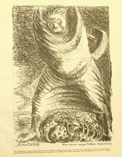 Aus einem neuzeitlichen Totentanz. Lithographie aus "Der Bildermann", 1916. 29x20,5 cm, typografisch bezeichnet und im Stein signiert. (WVZ: Laur I 029). Rückseitig eine Lithographie von Max Slevogt "Über die Grenzen in weitem Land unendlicher Schmerz die Flügel spannt". (so erschienen). *Ernst Heinrich Barlach (* 2. Januar 1870 in Wedel - 24. Oktober 1938 in Rostock) war ein deutscher Bildhauer, Schriftsteller und Zeichner. Er hinterließ ein vielgestaltiges druckgraphisches, zeichnerisches und literarisches Werk.