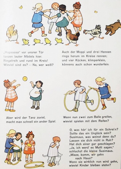 Eine ganz fidele Rechnerei. (Bilder) von Gertrud Caspari. Leipzig, Hahn, o. J. (um 1930). 4°. [11] Bl. mit farb. Illustrationen. Farbig illustr. OHLn. mit illustr. OU. (Verlags-Nr. 20). Blaume, Holst 134. Slg. Cotsen 4938. Klotz 2869/134. Klotz, Bilderbücher I, 843/26. LKJ I, 248. Neubert, Caspari 42.1.1. - Am Anfang und Ende mit jeweils einem Gedicht auf geriffeltes Papier gedruckt. Das vord. Gedicht-Bl. unten mit dem Vermerk: "Die Idee dieses Buches stammt von Hanns Seller-Augsburg, nach der es dann G.Caspari und Ad.Holst in der vorliegenden Form ausgestaltet haben". - "Ein besonders gelungenes Beispiel eines Beschäftigungs-Bilderbuches" (K. Blaume). - Exemplar mit den oft fehlenden bei Neubert erwähnten beiden Papierstreifen mit denen ein Teil der Bilder abgedeckt werden kann. - Der seltene Schutzumschlag etwas angestaubt und mit Randläsuren, sonst sehr gutes sauberes Exemplar.