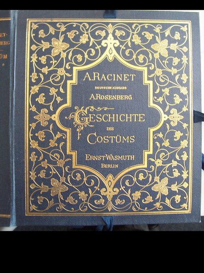 Geschichte des Costüms in 500 Tafeln in Gold-, Silber- und Farbendruck mit erläuterndem Text. Deutsche Ausgabe bearbeitet v. A. Rosenberg. Berlin, Wasmuth, 1888. NUR die angegeb. lith. Taf. m. dem jeweils zugeh. Text. Bd. 1: 4-5; 6-7 (Text Orig., Taf. Kopie); 8; 10-14; 17; 21; 22 (Text Orig., Taf. Kopie); 24; 27-28; 30-31; 33-34; 35 (Text Orig., Taf. Kopie); 39-45; 47; 50-55; 56-57 (Text Kopie, Taf. Orig.); 58-61; 62 (Text Orig., Taf. Kopie); 63-66; 69-77; 79; 81-82; 85; 88-91; 94-100; Bd. 2: 101-102; 104-120; 121 (Text Orig., Taf. Kopie); 122-130; 132-137; 138 (Text Orig., Taf. Kopie); 140; 141 (Text Orig., Taf. Kopie); 142; 144-148; 151-153; 154 (Text Orig., Taf. Kopie); 155-166; 167-168 (Text Orig., Taf. Kopie); 169-173; 174-175 (Text Orig., Taf. Kopie); 176-180; 182-184; 186-188; 189 (ohne Taf.); 192; 193 (Text Orig., Taf. Kopie); 194-200; Bd. 3: 201-209; 211 (Text Orig., Taf. Kopie); 214-215; 216 (Text Kopie, Taf. Orig.); 221-222; 223 (Text Orig., Taf. Kopie); 224-234; 236; 238-238 (Text Orig., Taf. Kopie); 240; 241-242 (Text Orig., Taf. Kopie); 243-244; 245 (Text Orig., Taf. Kopie); 246-251; 254; 255 (Text Orig., Taf. Kopie); 262; 264;266 (Text Orig., Taf. Kopie); 268-271; 273-274; 278-285; 287-288; 290-295; 296 (Text Kopie, Taf. Orig.); 297-298; 299 (Text Orig., Taf. Kopie); 300; Bd. 4: 301; 304; 305 (Text Orig., Taf. Kopie); 306-311; 313-319; 320 (Text Orig., Taf. Kopie); 322-323; 328 (Text Orig., Taf. Kopie); 328-331; 333; 335 (ohne Taf.); 336; 337 (Text Orig., Taf. Kopie); 338-340; 343; 348; 350; 351-353 (Text Orig., Taf. Kopie); 354-355; 359-363; 364 (Text Orig., Taf. Kopie); 365; 368-369; 370 (Text Orig., Taf. Kopie); 371-372; 373 (Text Orig., Taf. Kopie); 374-376; 377 (Text Orig., Taf. Kopie); 378-381; 383; 384-385 (Text Orig., Taf. Kopie); 388; 389 (Text Orig., Taf. Kopie); 390; 391-392 (Text Orig., Taf. Kopie); 393-396; 399; 400 (Text Orig., Taf. Kopie); Bd. 5: 405-406; 408-415;416 (Text Orig., Taf. Kopie); 417-424; 425-426 (Text Orig., Taf. Kopie); 427-428; 430; 432-433 (Text Orig., Taf. Kopie); 436-437; 441-443; 444 (Text Orig., Taf. Kopie); 445; 447; 448 (Text Orig., Taf. Kopie); 449-455; 460; 463-469; 473 (Text Orig., Taf. Kopie); 474; 475-476 (Text Orig., Taf. Kopie); 477-478; 481-482 (Text Orig., Taf. Kopie); 483-485; 487-489; 491; 492 (Text Orig., Taf. Kopie); 495-496 (Text Orig., Taf. Kopie); 498-500. Lose Blätter in goldgepr. OLwd.-Mappen m. Stoffschließbändern (NUR 2-5, diese leicht bestoßen u. berieben). Taf. u. Blätter teils m. min. Randläsuren. Ränder teils angestaubt bzw. fingerfleckig. Angegeb. Kopien sind jeweils verkleinert u. in schwarz/weiß. . Lipperheide I, 93. Colas 2471. Erste deutsche Ausgabe, bearb. v. A. Rosenberg. - Die Tafeln zeigen Trachten, Waffen, Gerätschaften, Eingeborene in ihrer häuslichen Umgebung, Möbel etc. aus dem klassischen Altertum, der außereuropäischen Welt, Europa vom Mittelalter bis zum XIX. Jahrhundert und dem modernen Europa.
