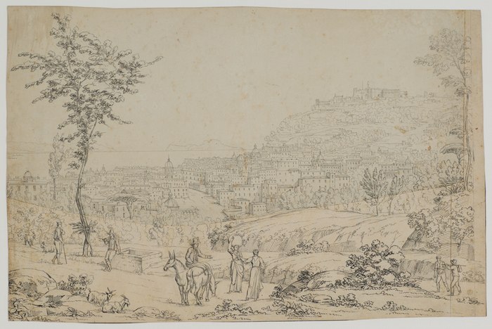 Blick auf Neapel mit Blick nach Capri, rechts oben Castel Sant?Elmo; mit Figurenstaffage im Vordergrund. _. Feder in Schwarz, über Bleistift, auf cremefarbenem Velin, aufgezogen. 31,5:48,7 cm. Das untere Drittel der Zeichnung sowie ca. 2 cm des rechten Randes wurden von Rebell korrigiert und mit dem neuen Entwurf überklebt, horizontale Mittelfalte geglättet, insgesamt etwas vergilbt. Vorstudie für ein Gemälde. Möglicherweise besteht ein Zusammenhang mit dem Auftrag für J. Murat 13 Ansichten von Neapel zu malen (s.u.). An der Wiener Akademie studierte Rebell zunächst Architektur bei Louis Joseph Montoyer (um 1749-1811), wechselte dann aber zur Landschaftsmalerei. Michael Wutky (1739-1823), der ?alte Italienfahrer? wurde sein Lehrer. Bei ihm lernte er das ?Effektstück?, etwa Nachtbilder oder Vesuvausbrüche kennen. 1809 ging Rebell in die Schweiz, von da nach Mailand und anschließend 1810 nach Oberitalien. Hier bewegte er sich im Gefolge um E. Beauharnais. Auf dessen Empfehlung malte er für J. Murat in Neapel 13 Ansichten von Neapel, die für Caroline Murat bestimmt waren (1813 - 1815). Er war auch erfolgreich mit Marinen, wandte sich dann aber doch nach Rom, wo er im Kreis der österreichischen Künstler bis 1824 lebte. Bei einem Besuch 1819 in Rom wurde Österreichs Kaiser Franz I. auf Rebell aufmerksam und berief ihn zum Direktor der kaiserlichen Gemäldegalerie nach Wien. 1826 wurde er akademischer Rat und hatte mit seinen lichterfüllten, leuchtenden Arbeiten einen bedeutenden Einfluß auf die Entwicklung der Wiener Landschaftsmalerei (vgl. Ausst. Katalog: Das Jahrhundert des Wiener Aquarells 1780 - 1880. Wien, Albertina, Wien 1973, p. 14).