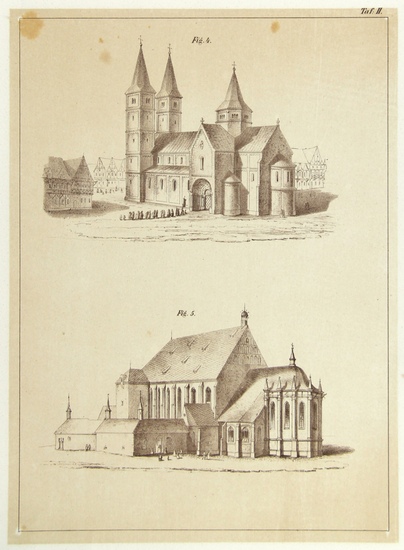 Der Dom zu Freiberg. In geschichtlicher und kunsthistorischer Beziehung beschrieben. Freiberg, J. G. Engelhardt 1862. * Mit 4 getönten lithographischen Tafeln. 4 Blatt, 52 Seiten. 30 x 23,5 cm. Schlichter Halblederband der Zeit (etwas berieben). *** Der Freiberger Architekt und Hochschullehrer Eduard Heuchler (1801-1879) arbeitete zunächst als Bergjunge in den Erzgruben seiner Heimatstadt, wurde aber bald gefördert und konnte an der Bergakademie Freiberg studieren. Nach ausgedehnten Auslandsaufenthalten lehrte er Zeichen- und Zivilbaukunst an der Bergakademie Freiberg und bekleidete dort schließlich von 1844 bis 1873 die Professur für Zivilbaukunst, Geometrie, Freihand- und Maschinenzeichnen. - Es fehlt leider die auf dem Titel angegebene photographische Tafel. - Titelblatt und erste Seiten mit sich abschwächender, unschöner bräunlicher Verfärbung. Zarter Besitzvermerk. Letzte Textseite mit zeitgenössischen Anmerkungen in Blei. Mitunter etwas braunfleckig. - Insgesamt ordentliches Exemplar des seltenen Titels.