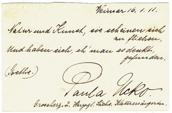 Eigenh. Albumblatt mit Unterschrift auf Postkarte. Weimar, 16. I. 1911. Quer-kl.-8vo. 1 p. Postgelaufen. ?Natur und Kunst, sie scheinen sich zu fliehen, Und haben sich, eh? man es denkt, gefunden. (Goethe)?.