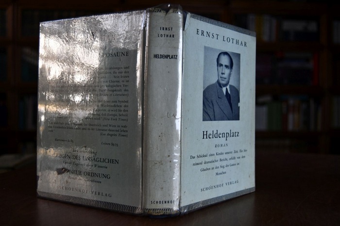 Heldenplatz. Roman. Cambridge Mass.,Schoenhof, 1945. Dt. EA 405 S. 20 x 14 cm, Leinen mit OSchUund privatem Folieneinband. Schutzumschlag berieben, bestoßen, fleckig, mit Einrissen und Verlust. Schnitt fleckig. Innen sauber. WG I, 24.