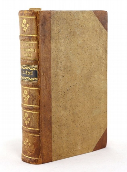 Gotthold Ephraim Leßings Theatralischer Nachlaß. Erster und Zweyter Theil. Berlin, Christian Friedrich Voß und Sohn, 1784, 1786. 2 Titelvignetten, Vorsatz mit Widmung des Rechtsgelehrten Ferdinand Kaemmerer (1784-1841) an seinen Kollegen an der Universität Rostock Joachim Heinrich Pris, Titel verso Eintrag in alter Tinte "Ex libris Ferd. Kaemmerer" u. Stempel der Universität Rostok, der Kaemmerer seine Bibliothek vermacht hatte, mit Ausscheidungsstempel. LVI, 248 S., XLVI, 268 S., 2 in 1 Band. Zustand 3, Decke etwas berieben, Ecken bestoßen, Rücken fleckig, vorderes Vorsatz rechts oben Eckabschnitt, durchgehend braunfleckig.