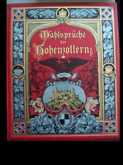 Wahlsprüche der Hohenzollern. Zusammengestellt u. historisch erläutert. Breslau, Hirt, 1884. Fol. M. 29 farb. lith. Taf. Insges. 65 Bl. Lose in 1 dekorativen ill. OLwd.-Mappe. Hint. Deckel eine Ecke m. schwacher Nässespur, sonst wohlerhalten. = Ausgabe B (Familien-Ausgabe).