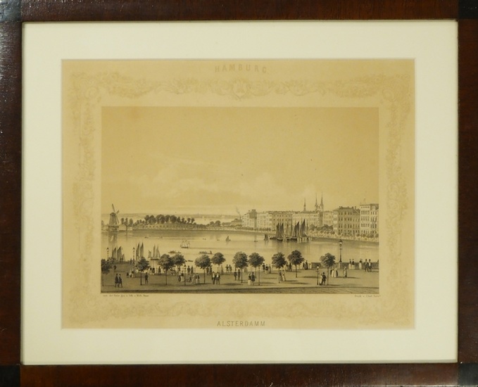 Alsterdamm. Doppeltondruck nach der Natur gez. und lith. v. Wilhelm Heuer. [Hamburg, Carl Gassmann (gedr. von Charles Fuchs), [nach 1857]. Unkolorierte Lithographie mit ornamentaler Wappenbordüre. 15,3 x 22,8 cm. Altgerahmt (Mahagonirahmen mit aufgelegten Ebenholzecken ["Hamburger Rahmen"], 32 x 39,5 cm). Mit den zwei Türmen der Reformierten Kirche, die 1854 bis 1857 von Ed. Averdieck in der Fedrinandstraße erbaut worden ist. (Salomon 31b, FH; Müller/Schramm S. 37). - Christian Ludwig Wilhelm Heuer (1813-1890), Maler, Radierer, Lithograph, Schüler der Gebrüder Suhr (Der Neue Rump, S. 188).