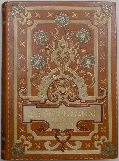 Die Bücherliebhaberei in ihrer Entwicklung bis zum Ende des XIX. Jahrhunderts. Ein Beitrag zur Geschichte des Bücherwesens. Bielefeld und Leipzig, Velhagen & Klasing, 1898. Ca. 23,5 x 17,5 cm. XII Seiten, 335 Seiten, mit 2 montierten farbigen Einbandproben, 2 Falttafeln und zahlreichen Abbildungen. Rotbrauner geglätteter Maroquinband mit reichem, floralen Intarsien-Ornament auf Vorderdeckel und Rücken, Steh- und Innenkantenvergoldung, Vorsätzen aus Steinmarmorpapier in Gold, Blau, Grau und Rot sowie Ganzgoldschnitt mit floralem gepunzten Dekor. "Diejenigen aber, welche prinzipiell die Bücherliebhaberei verwerfen oder tadeln, möchte ich doch darauf aufmerksam machen, dass das gedruckte Buch, so unscheinbar es auch äusserlich ist, oftmals eine gewaltige Macht von unberechenbarer Tragweite ist, eine Kulturerscheinung, mit der sich ernsthaft und eingehend zu beschäftigen wohl der Mühe lohnt." (Otto Mühlbrecht in seiner Einleitung). Gelenke und Kanten etwas berieben, eine Ecke leicht bestoßen, Intarsien stellenweise mit kleinen Läsuren. Insgesamt gleichwohl schönes Exemplar der Standardpublikation in einem ungewöhnlich aufwendigen Meistereinband.