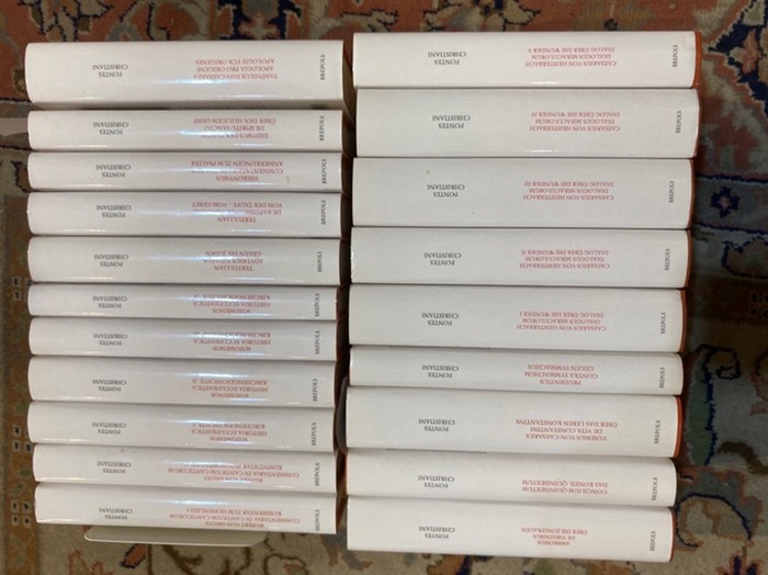 Fontes Christiani. 5 Reihe, (Band 69-85). Vorhanden sind folgende 20 Bände: 70,1; 70,2; 73,1; 73,2; 73,3; 73,4; 75; 76; 78; 79; 80; 81; 82; 83; 85; 86,1; 86,2; 86,3; 86,4; 86,5. Freiburg, Herder ( Brepols 2018-2021. Leinen. Alle Bände sind mit einer Klarsichtfolie sauber und ordentlich überklebt, darüber die Schutzumschläge, so daß es nicht weiters auffällt und die Bände sogar noch schützt. 3 Bände mit mehreren Anstreichungen mit Farbstift. Einige wenige Schutzumschläge mit leichten Gebrauchsspuren. Dies alles im Preis berücksichtigt.