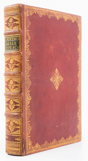 Caeremoniale Episcoporum Clementis VIII. Primum, Dein Innocentii X. Nunc Denuo Benedicti PP. XIII. - Rom:, Typis Caroli Giannini et Hieronymi Mainardi Impressorum, 1729. lxiv, 439 Seiten, goldgeprägter Ganzlederband der Zeit (Maroquin) auf fünf Bünden, Goldschnitt, 23,5 x 17 cm. Reich illustriertes Handbuch zu den zeremoniellen Verpfllichtungen der Bischöfe. - Mit gestochenem Titelkupfer, 65 weiteren Textkupfern und zahlreichen Holzschnitt-Schmuckinitialen. Durchgehend in Rot- und Schwarzdruck; teils mit Noten. Der Text in lateinischer Sprache. - Provenienz 1.: Gestochenes Wappenexlibris des Basler Bischofs Simon Nikolaus Eusebius von Frohberg-Montjoie auf dem vorderen Spiegel (quadriertes Wappen mit Krummstäben und Schlüsseln unter Bischofshut und Krone; der Wappenschild gehalten von zwei Putti). Das Exlibris in der Platte signiert J[ohann] Striedbeck del. et sc. Argent. Der Name des Besitzers nicht auf dem Exlibris selbst (ermittelt nach der Zeitschrift für Bücherzeichen 7, 1897, 87). - Provenienz 2.: montiertes handschriftliches Bucheignerzeichen eines Priesters auf dem vorderen Spiegel (20. Jahrhundert; unleserlich). - Provenienz 3.: Bernd Oetter (Diplomat, 1937-2022; Exlibris auf dem vorderen fliegenden Vorsatzblatt). - Minimal berieben und bestoßen; teils gering fingerfleckig; Seite 133/134 mit sauberer älterer kleiner randlicher Papierreparatur. Sonst und insgesamt gutes, attraktives Exemplar.