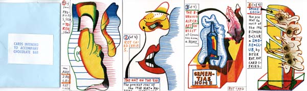 Cards intended to Accompany Chocolate Bar. S.M.S. N° 6, 1968. New York., The Leter Edge Press in Black Press., 1968. 11,6 x 7,7 cm. 4 Blatt. OPapier-Banderole., 66683A. Sehr gutes Exemplar. Vier farbigeOffest-Lithographien auf Karton in blauer Papierbanderole mit Titelschildchen und Metallklammer. Das Set war Bestandteil der von William Copley herausgegebenen Multiple - Edition S.M.S. [Shit must stop]. Die Karten sind jeweils verso Drucksigniert und datiert 1968.
