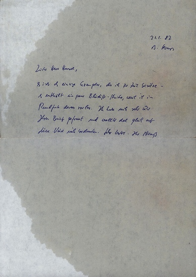 Handschriftlicher Brief mit Unterschrift. (Botho Strauß, geb. 02.12.1944 in Naumburg, deutscher Schriftsteller und Dramatiker. 1987 erhielt er den Bayerischen Literaturpreis, Jean-Paul-Preis, zur Würdigung des literarischen Gesamtwerks). _. 5-zeiliger handschriftlicher signierter Brief von Botho Strauß an den Theaterkritiker Georg Hensel in blauer Tinte, DIN-A4-Format, datiert 21.1.[19]87. Blatt mittig mit horizontaler Knickspur und zur Hälfte (farblos) fettfleckig. Insgesamt noch sehr gutes Exemplar.