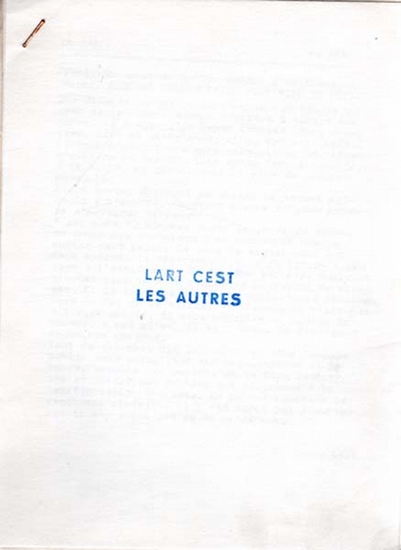 L'art c'est les autres. Nice., Selbstverlag Ben Vautier., (1966). 16,5 x 21,5 cm. 11 unpaginierte Blatt, geklammert., 67212AB. Sehr gutes Exemplar. Titel in Blau gestempelt, 11 lose Blatt, geklammert. Enthält den Text 'La table' von Ben und auf dem letzten Blatt von Robert Filliou '1 Enumeration'. Rückseitig handschriftlich mit Bleistift bezeichnet "März 66 von Ben Vautier geschenkt erhalten." [Geschenk von Erik Andersch, der das Heft 1966 von Ben Vautier erhielt, an den Vorbesitzer].