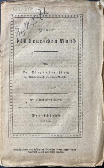 Ueber den deutschen Bund, ein Versuch die Gränzen der Staaten überhaupt, und Deutschlands insbesondere auf absolute staatswirthschaftliche und militärische Principien zurückzuführen ... Mit 2 gefalt. illuminierten Karten. Deutschland (d.i. Erlangen), (Heyder), 1816. 125 Seiten. Orig.-Broschur (etwas bestoßen, Nr. auf Umschlag). Erste Ausgabe, selten. - Dieser Titel nicht bei Menger u. ADB 18, S. 739-41 - Etwas gebräunt, sehr breitrandiges, unbeschittenes Exemplar. PA2-87.