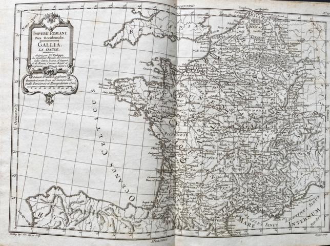 Recueil de cartes pour l`étude de l`histoire de romaine. Atlas. Mit 7 (von 13, 4 doppelblgr.) Kupferstichkarten. Paris, Nyon, 1787. 4°. Halbleder d. Zt. (berieben, ohne Rücken). Extraatlas mit Karten aus dem Atlas Universel. Enthält: Gallia - Rome ancienne - Position des principaux royaumes - Expédition d`Annibal en Italie - L`Italie aves les provinces de César - Théatre de la campagne sur le Segra ou Sicoris - Théatre de la campagne en Afrique. - Karten etwas fleckig, im unteren Mittelfalz mit Feuchtigkeitsfleck. Ha-A1-16.