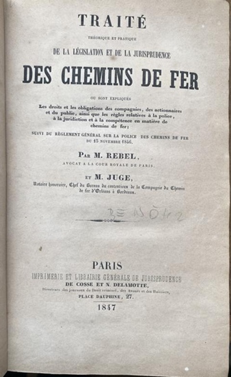 Traité théorique et pratique de la législation et de la jurisprudence des chemins de fer, ou sont expliqués les droits et les obligations des compagnies, des actionnaires et du public, ainsi que les règles relatives à la police, à la juridiction et à la compétence en matière de chemins de fer; suivi du Règlement général sur la police des chemins de fer du 15 novembre 1846. Paris, De Cosse et Delamotte, 1847. 3 Bll., 472 Seiten. Halbleinwand d. Zt. mit verg. Rückentitel. Seltene Original-Ausgabe (im Handel nur Nachdrucke verfügbar). - Seltene Abhandlung über die Gesetzgebung und die Rechtsprechung der Eisenbahnen, in der die Rechte und Pflichten der Gesellschaften, der Aktionäre und der Öffentlichkeit erläutert werden, sowie die Vorschriften über die Polizei, die Gerichtsbarkeit und die Zuständigkeit in Sachen Eisenbahnen; gefolgt von der Allgemeinen Verordnung über die Polizei der Eisenbahnen vom 15. November 1846. - Papierbedingt etwas gebräunt. - Aus dem Besitz von Prof. Benöhr mit seinem eigenh. Namenszug. Ha-A5-98.