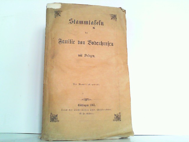 Stammtafeln der Familie von Bodenhausen mit Belegen. Als Manuscript gedruckt. Göttingen, Druck der Dieterischen Univ.-Buchdruckerei W. Fr. Kästner, 1865. 8°, IV, 420 Seiten mit 9 genealogischen Stammtafeln, betitelte Originalbroschur - Einband mit Gebrauchssp. sonst guter Zustand, unaufgeschnitten - 1865. c108650.