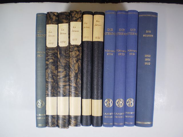 Die Sterne. Monatsschrift über alle Gebiete der Himmelskunde. Konvolut von 10 Bänden Leipzig, Verlag Johann Ambrosius Barth, 1928-1950. Leinen, gebunden; blaue Einbände, Rückengoldprägung / Halbleder, gebunden; schwarze Einbände / kartoniert, gebunden; schwarzbraun marmorierte Einbände / 10 Bände / Anz. Seiten: 264, 276, 274, 280, 288, 288, 288, 288, 288, 252 / 16,8 x 24,3 cm / mit zahlreichen, schwarzweissen Abbildungen auf Tafeln und im Text / Zustand: gut, leichte Gebrauchsspuren; Einband etwas berieben und leicht lichtrandig, Schnitt und Papier gebräunt, Kopfschnitte teils etwas bestaubt, mit zahlreichen Besitzerstempeln. Inhalt: 8. Jahrgang; 9. Jahrgang; 10. Jahrgang; 11. Jahrgang; 12. Jahrgang; 13. Jahrgang; 14. Jahrgang; 15. Jahrgang; 16. Jahrgang; 26. Jahrgang.