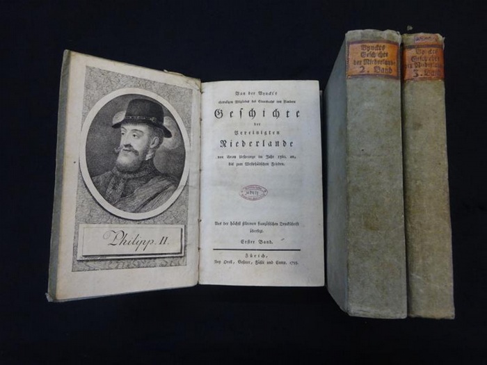 Geschichte der Vereinigten Niederlande von ihrem Ursprunge im Jahr 1560 an, bis zum Westphälischen Frieden. Aus der höchst seltenen französischen Druckschrift übersezt. 1.- 3. Band. Zürich, Orell, Geßner, Füßli und Comp. 1793. "8°. 3 Tle. Gest. Frontisp., Titelbl., 8 nn. Bll., 489 S.; Gest. Frontisp., Titelbl., 2 nn. Bl., 517 S., 1 nn. Bll.; Gest. Frontisp., S. 3-406. Pappbände d. Zeit, mit schwarzgeprägten Rückenschildchen, Ecken bestossen, Papierbezüge fleckig, vordere Einbanddeckel des zweiten und dritten Bandes an den oberen Kapitalen etwas eingerissen. Seiten teilw. schwach gebräunt oder braunfleckig. Mit kleinen Besitzstempeln auf den Titelblättern (Schöller'sche Familien-Bibliothek)." VD18 11049359. Fromm 6,181,26063 a - dreibändige deutsche Übersetzung in Erstauflage der 'Histoire des troubles des Pays-Bas' des aus Gent stammenden Juristen und Historikers Luc J. J. van der Vynckt (1691-1779). Das Werk dient bis heute als hilfreiche Quelle zur Geschichte dieser Region. Die gestochenen Porträttafeln zeigen jeweils eine historische Persönlichkeit der beschriebenen Periode.