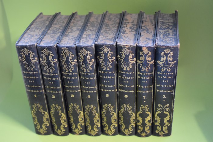 Schlossers Geschichte des achtzehnten Jahrhunderts und des neunzehnten bis zum Sturz des französischen Kaiserreichs. Mit besonderer Rücksicht auf den Gang der Literatur [später: Mit besonderer Rücksicht auf geistige Bildung]. 8 Bücher: 7 Bände und Register komplett F.C. Schlosser. Heidelberg, Mohr 1843-1849. Mischauflage (1.-3. Auflagen) XVI, (1). 681+IV,672,(1)+XVI, 655,(1)+XI,II,593+XIV,755+X,715,(1)+IV,600+(2),II,601-2332;(1),208,(1)S., 21cm Halbleder. 0 Zustand: 8 Bücher. Einheitliche Halbledereinbände der Zeit mit reicher Vergoldung, etwas berieben, Lederecken teils abgerieben, schwarzes Bezugspapier, Buntpapiervorsätze, Marmorschnitt, Namenseintrag der Zeit, alter Namensstempel und Nummerierung auf Titelseite, wenig gebräunt, Verschwindend gering fleckig, fest, Frakturschrift. Bände I-IV in dritter durchaus verbesserter Auflage, V in zweiter Auflage, die Folgebände wohl in erster Auflage, Register 1949 in zweiter und dritter Auflage. Dekorative, guterhaltene Exemplare. --- Inhalt: Friedrich Christoph Schlosser (1776-1861) war ein deutscher Historiker. Seine zwei bekanntesten Werke sind die teils von ihm verfasste, teils auf der Grundlage seiner Veröffentlichungen von Georg Ludwig Kriegk zusammengestellte Weltgeschichte für das deutsche Volk und die mehrfach überarbeitete Geschichte des achtzehnten Jahrhunderts und des neunzehnten bis zum Sturz des französischen Kaiserreichs, die bis 1865 fünf Auflagen erlebte. Schlosser ging nicht darauf aus, durch schöne Form zu wirken, stand vielmehr in ausgesprochenem Gegensatz zu der kritischen, so auch der künstlerischen Geschichtsschreibung. Der wissenschaftliche Gehalt seiner Werke steht hinter der moralischen Wirkung weit zurück, aber der für seine Zeit charakteristische Liberalismus seiner Auffassung hat seine Werke dem Verständnis des Volkes nähergebracht als die irgendeines andern Geschichtsschreibers (Meyers Großes Konversationslexikon, 1905). Schlosser wirkte stark auf die politischen Anschauungen des Mittelstands und des aufstrebenden Bürgertums. Er war selbst nie politisch tätig. [wikipedia] HZ4-6.