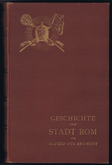 Geschichte der Stadt Rom in drei Bänden. Komplett. Berlin, Verlag der Königlichen Geheimen Ober-Hofbuchdruckerei R. v. Decker, 1867. Der 3. Band erschien 1868 und 1870. Mit 28 Stammtafeln und 6 ausklappbaren Plänen. Gr.8°, ca. 24,5 x 16,5 cm, Orig.-Leinenbände. Band I mit 7 Stammtafeln und zwei ausklappbaren Tafeln (vergleichnender Plan des alten und neuen Rom / Rom in der Zeit der Könige mit den Regionen des Servius Tullius). Band II mit 12 Stammtafeln. Band III: zwei Teile in einem Band. 1. Teil mit 9 Stammtafeln (unter anderen: Sforza, Medici, Borgia) und zwei ausklappbaren Plänen am Ende des Gesamtbandes: 1. Vergleichender Plan des alten und neuen Lateran / 2. Vergleichender Plan der alten und neuen vaticanischen Basilica // 2. Teil mit 2 Plänen: 1.: Campagna Di Roma / 2.: Photolithographie der Gebrüder Burchard in Berlin nach einem Plan von 1748: Plan von Rom nach Silvio Valenti Benedicti XIV Administro Urbis Ichonographiam a Leonardo Bufalino ligneis formis evulgata, servata proportione contractam atq. aeri incisam Jo. Bapta. Nolli... Bände fleckig, Rücken mit Einrissen, Seiten vereinzelt fleckig, jeweils Name auf Vorsatz, Name auf Titel überklebt, sonst gut erhalten.