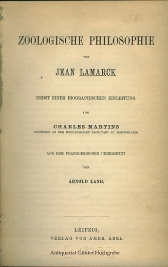 Zoologische Philosophie nebst einer biographischen Einleitung von Charles Martins. 3 Teile in einem Band. Leipzig, Verlag von Ambr. Abel, 1873. Aus dem Französischen übersetzt von Arnold Lang. 8°, LII, XXIV, 511 S. mit Errataverzeichnis auf letztem Blatt, Original-Halbleder. Druck der Fr. Mauke'schen Offizin in Jena. Aus dem Inhalt: Motive des Werkes und allgemeine Gesichtspunkte über die Gegenstände, die in demselben behandelt werden / Betrachtungen über die Naturgeschichte der Thiere, ihre Charactere und Beziehungen, ihren Bau, ihre Anordnung und Eintheilung und ihre Arten / Betrachtungen über die physischen Ursachen des Lebens, über dessen Existenzbedingungen, über die erregende Kraft seiner Bewegungen, über die Fähigkeiten, die dasselbe den Organismen verleiht und über die Resultate seiner Existenz in diesen Organismen / Betrachtungen über die physischen Ursachen des Gefühls, über diejenigen, welche die erregende Kraft der Thätigkeiten bilden und endlich über diejenigen, welche die Verstandesprocesse hervorrufen, die bei verschiedenen Thieren beobachtet werden. KLL. Hauptwerk von Jean-Baptiste Antoine Pierre de Monet, Ritter von Lamarck (geb. in Bazentin am 1.8.1744, gest. in Paris am 18.12.1829). Carter-Muir: "Die Zoologische Philosophie ist ein klassisches Werk der Literatur zur Evolutionstheorie... Lamarck zeigte, daß es möglich war, alle Lebensformen in eine einfache Ordnung zu bringen, wenn man mit den niedrigsten und einfachsten Arten begann.". Buchrücken fehlt, durch Papierstreifen ersetzt, privater Schutzumschlag, Exlibris auf Vorsatz, Vorsätze mit Einriss, papierbedingt gebräunt.