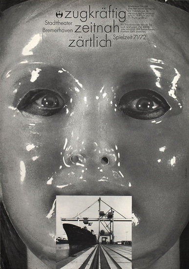 Zugkräftig - Zeitnah - Zärtlich. Spielzeit 1971/72. [Original-Theaterplakat]. _. (Frieder Grindler, geb. 03.06.1941 in Berlin, deutscher Grafikdesigner. Er gehört der Kasseler Plakatkunst Schule an). Original-Plakat von Frieder Grindler zur Spielzeit 1971/1972 des Stadttheaters Bremerhaven. Maße Blatt: 84,3 x 59,3 cm. Blattkanten wenig berieben und wenig knittrig (letzteres nur auf der Rückseite sichtbar). Oberkante mit einem kleinen Einriss (ca. 1 cm). Allgemein sehr guter Zustand.