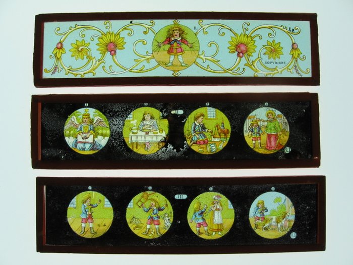 Der Struwwelpeter. 12 Bildstreifen für Laterna Magica. Nürnberg, Ernst Plank., o.J. Komplette Serie von 12 Bildstreifen aus Glas für die Vorführung mit der Laterna Magica. Größe der Streifen: 17 x 4,5 cm. Jeder Streifen besteht aus 2 dünnen Glasscheiben, zwischen denen sich die Bilder befinden. Umlaufend befindet sich eine Umrandung aus rotem Papier.o.J. (Vorbemerkung zum Zustand: Entfärbungen in den schwarzen Umrandungen, vermutlich entstanden durch schlechte Lagerung, sind beim Betrachten mit der Laterne nicht sichtbar, da nur das runde Bild gezeigt wird. - Streifen I, Titel: sehr guter Zustand. - II, Christkind kommt: Bilder auch etwas von der Entfärbung betroffen. - Streifen III, Friedrich: Bilder befriedigend. Streifen IV, Friedrich: 2 Bilder auch etwas von der Entfärbung betroffen. - Streifen V, Feuerzeug: Bilder gut. - Streifen VI, Daumenlutscher: Bilder gut. - Streifen VII, schwarze Buben: Bilder gut. - Streifen VIII, schwarze Buben: sehr guter Zustand. - Streifen IX, Suppenkasper: Bilder kaum von der Entfärbung betroffen und gut. - Streifen X, Zappelphilipp: guter Zustand. - Streifen XI und XII, Hanns Guck in die Luft: Entfärbungen, Bilder leider auch stärker betroffen. Rote Papierumrandungen an wenigen Stellen abgelöst) - *** sehr selten! - (Lager 30 V).