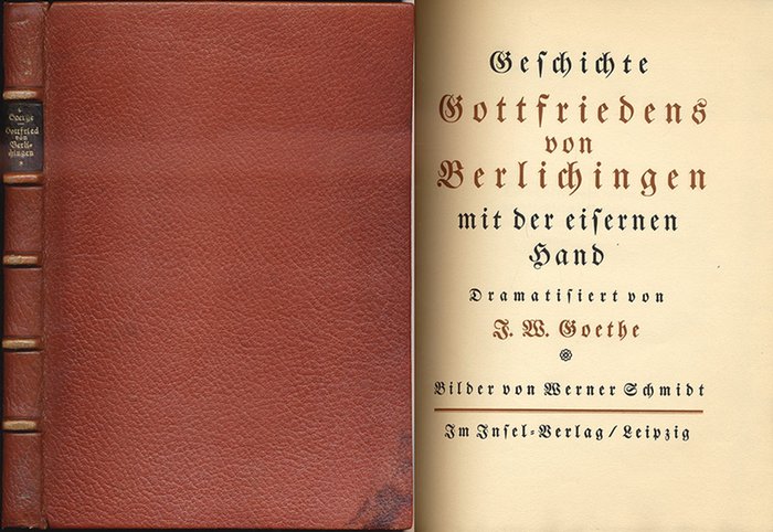 Geschichte Gottfriedens von Berlichingen mit der eisenern Hand. [Ganzlederband]. Leipzig, Insel Verlag, [1925]. 4°. 28 x 21 cm. 166 Seiten, (1) Blatt. Roter Original-Lederband auf 5 Zierbünden mit Kopfgoldschnitt, vergoldeten Kantenfileten und schwarzem Rückenschild mit goldgeprägtem Titel. Nummer 20 von 220 handnummerierten Exemplaren. Sarkowski 584. Rot-schwarz gedrucktes Titelblatt. Mit den 19 Original-Lithographien als Textillustrationen und weiteren 10 lithographierten Vignetten von Werner Paul Schmidt zu Goethes Götz von Berlichingen. Diese Ausgabe folgt buchstabengetreu der Goetheschen Handschrift vom Jahre 1772. Den Text druckte die Spamersche Buchdruckerei in Leipzig, die Lithographien - unter der Aufsicht des Künstlers - die Firma F. Wolf & Sohn in München. Gedruckt auf Büttenpapier mit Schöpfrand. Handeinband mit Buchbindersignet der Buchbinderei Enders, Leipzig, auf der Innenkante des Rückendeckels. Kanten und Bünde etwas berieben, dunkler Fleck in der rechten unteren Ecke des Vorderdeckels (6 x 4 cm), Seite 70 mit minimalem Fleck im Fußsteg (vermutlich schwarze Druckfarbe). Außen guter, innen sehr guter Zustand. Gilt-stamped original red leather binding with gilt top edge, handbound by Enders bookbinders in Leipzig. With original lithographs by Werner Paul Schmidt. Number 20 of 220 limited, handnumbered copies. Binding a bit rubbed, stain on front cover (corner, about 6 x 4 cm). Nearly fine copy.