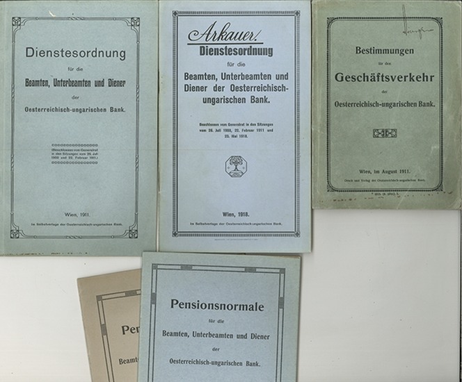 Konvolut: 5 Schriften der Oesterreichisch-ungarischen Bank. Wien, Vlg. d. Oesterreichisch-ungarischen Bank 1911-1918. kl.-8°. OBrosch. In gutem Zustand. 1.: Bestimmungen für den Geschäftsverkehr der Oesterreichsch-ungarischen Bank. Mit zahlr. roten Unterstreichungen u. einigen wenigen hs. Randbemerkungen. 172 S. Beiliegend: Bankplätze in Österreich-Ungarn. 7 S. - 2.: Dienstordnung für die Beamten, Unterbeamten und Diener der Oesterreichisch-ungarischen Bank. Wien 1911. 35 S., 4 Bll. - 3.: Pensionsnormale für die Beamten, Unterbeamten und Diener der Oesterreichisch-ungarischen Bank. 1912. 15 S. - 4.: Pensionsnormale für die Beamten, Unterbeamten und Diener der Oesterreichisch-ungarischen Bank. 1913. 16 S. - 5.: Dienstordnung für die Beamten, Unterbeamten und Diener der Oesterreichisch-ungarischen Bank. 1918. 36 S., 4 Bll. Die Oesterreichisch-ungarische Bank war eine Zentralbank, an der das kaiserliche Österreich (bzw. Cisleithanien oder Altösterreich) und das königliche Ungarn (Transleithanien) beteiligt waren. Sie bestand von 1878 bis 1922 und diente als Notenbank für die einheitliche Währung beider Reichshälften von Österreich-Ungarn, vorerst die Guldenwährung, später die Kronenwährung. Die Bank hatte ihre Hauptanstalten und Direktionen im heute als Palais Ferstel bezeichneten, ehemaligen Bank- und Börsegebäude im Zentrum Wiens und am Szabadság tér in Budapest; als offizieller Hauptsitz der Bank wurde Wien angeführt. Die Oesterreichisch-ungarische Bank ging auf der Grundlage des Österreichisch-ungarischen Ausgleichs von 1867 aus der Österreichischen Nationalbank hervor.
