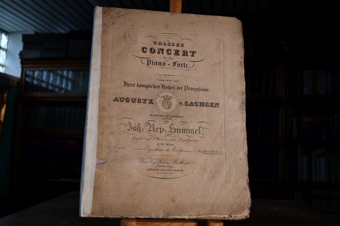 Grosses Concert für das Piano-Forte. Componirt und Ihrer königlichen Hoheit der Prinzessin Auguste von Sachsen ehrfurchtsvoll gewidmet von Joh. Nep. Hummel. Wien, Tobias Haslinger, [1821]. Druckplattennummer: 48 S. 35 x 27 cm, unbeschnittene, lose Doppelseiten. erieben, bestoßen, angeschmutzt, fleckig und mit Einrissen. Einige Bleistifteintragungen. Rücken papierstreifenverstärkt.