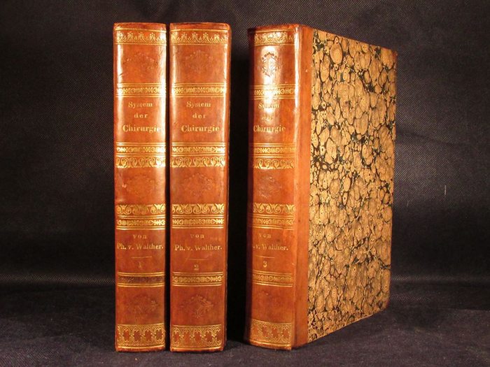 System der Chirurgie, Bände 1 - 3. München o. J. (ca. 1843 - 1852). 4 Bl., 338 S.; 4 Bl., 404 S.; 4 Bl., 408 S. Braune Original-Halblederbände mit goldgeprägten Rückentiteln und goldgeprägter Ornamentik sowie mit Lederecken und marmoriertem Buchschnitt. Es handelt sich um das gebundene handschriftliche Manuskript des Werkes. Der Chirurg und Ophthalmologe Philipp Franz Freyherr von Walther hatte von 1804 an eine Professur für Physiologie und Chirurgie an die Universität Landshut, von 1818 an eine Professur für Chirurgie und Augenheilkunde an der Universität Bonn.inne. Von Walther gilt als einer der Begründer der Chirurgie und Augenheilkunde als wissenschaftlicher Disziplinen in Deutschland. Im besonderen seine Forschungen zu den Ursachen des Grauen Stars waren bahnbrechend. Bände weder berieben noch bestoßen, Leder noch frisch wirkend. Sehr gutes, nahezu tadelloses Exemplar dieser außergewöhnlichen Manuskript-Ausgabe.