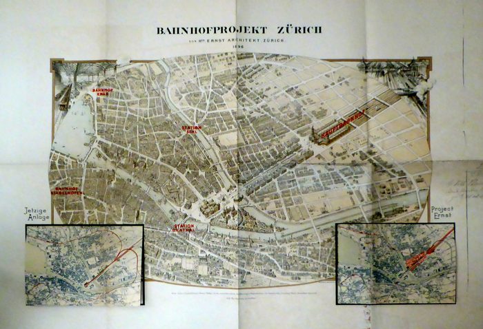 Bahnhofprojekt Zürich. von H[einri]ch Ernst, Architekt, Zürich 1896. Zürich, Hofer & Burger, 1896. 1 Blt., Einblatt, 100 x 73 cm; 72 x 45 cm (bxh) dreifach gefaltet. Hauri (Hofer & Burger) 311. Druckvorlage aus der Lithographieanstalt Hofer& Burger mit handschriftlich vermerkten und datierten (7.VIII. 96) Produktionsanweisungen. Genauer Bildplan aus der Vogelschau mit rot eingerücktem Hauptbahnhof, Station Central, Bahnhof Stadelhofen, Bahnhof Enge, Station Sihl. Unten in einen gedruckten Rahmen eingefügt links als Vorlage an einer Seite montiert der Plan für die "Jetzige Anlage" und rechts montiert der Plan für das "Projekt Ernst", je 23 x 15 cm (bxh). Im Hauptplan oben links Blick in die vorgesehene Halle des Bahnhofs Enge und oben rechts ein Blick in den Hauptbahnhof. Für den Hauptplan wurde ein früherer Druck verwendet, die Montagen über decken jeweils Eisenbahnkarten in kleineren Massstäben. Unikat. Etwas angestaubt. Im breiten Rand, ohne Beschädigung des Kartenbildes, an zwei Stellen Pilzschaden. An den Rändern, ebenfalls ohne Beschädigung des Kartenbildes, kleine Einrisse in den Falzen.