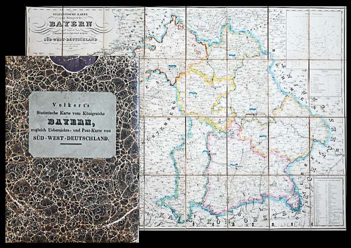 Statistische Karte vom Königreich Bayern. Zugleich Übersichts und Post-Karte von Süd-West-Deutschland. Entworfen und in Kupferstich ausgeführt von August Volkert?. München, Selbstverlag Volkert, 1844. circa 70 x 99 cm., Grosse kolorierte Kupferstich-Landkarte in 24 Segmenten. auf Leinen aufgezogen, in Mappe und Schuber mit bedrucktem Etikett Schöne Grosse Landkarte von Süddeutschland mit den Postverbindungen etc. Die Regionen und grossen Städte mit Grenzkolorit. - Nur leichte Gebrauchsspuren, Schuber berieben, sonst gut erhalten, sauber und dekorativ.